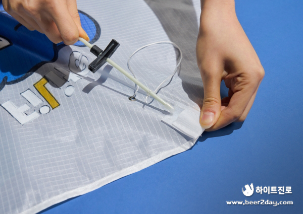 10. 연에 있는 구멍에 가장 긴 살대에 있는 실을 넣고 연의 앞면으로 빼서 얼레 실과 연결해 주세요.