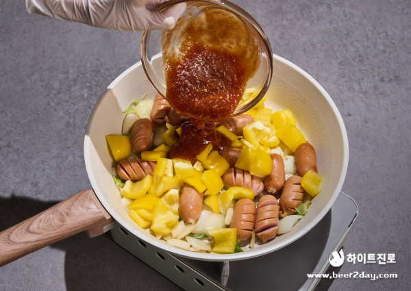 5. 소시지 칼집이 벌어지면 파프리카와 준비한 소스를 추가해 마저 볶아줍니다.