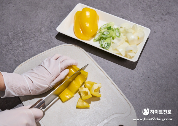 2. 파프리카, 양파는 한 입 크기로 깍둑 썰어주고, 대파는 어슷 썰어 준비해 줍니다.