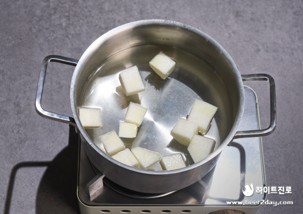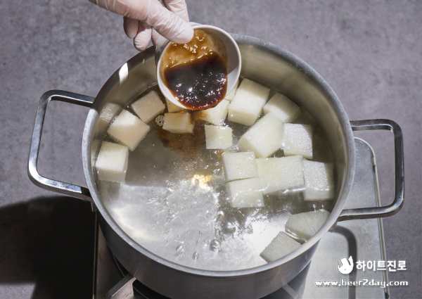 1. 물 1~1.5리터를 넣은 냄비에 깍둑 썬 무를 넣어줍니다.