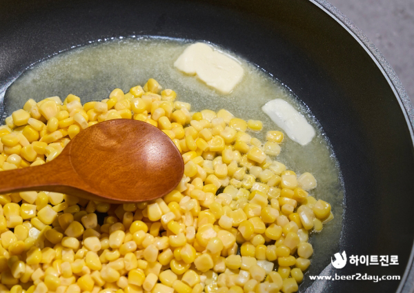 2. 프라이팬에 버터를 녹인 후 옥수수를 넣고 중불로 바닥에 수분이 보이지 않을 때까지 볶아줍니다.
