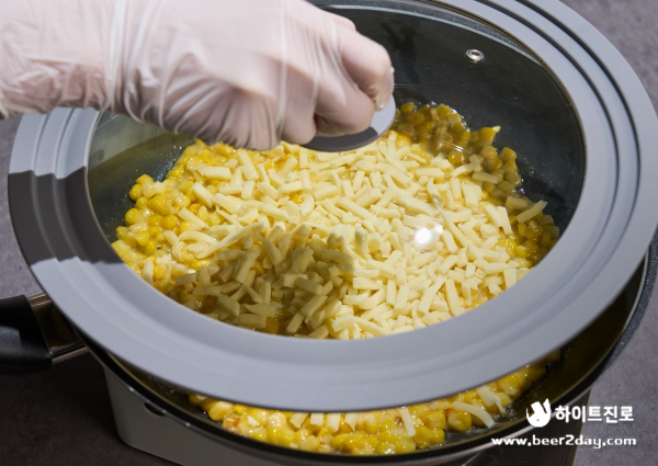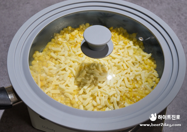 4. 설탕과 마요네즈가 골고루 섞이고 나면 피자치즈를 얹고 뚜껑을 닫아 치즈가 녹을 때까지 기다려주면 완성!