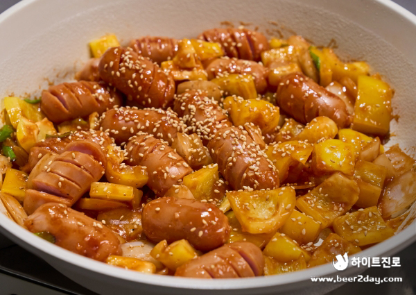 5. 소시지 칼집이 벌어지면 파프리카와 준비한 소스를 추가해 마저 볶아줍니다.