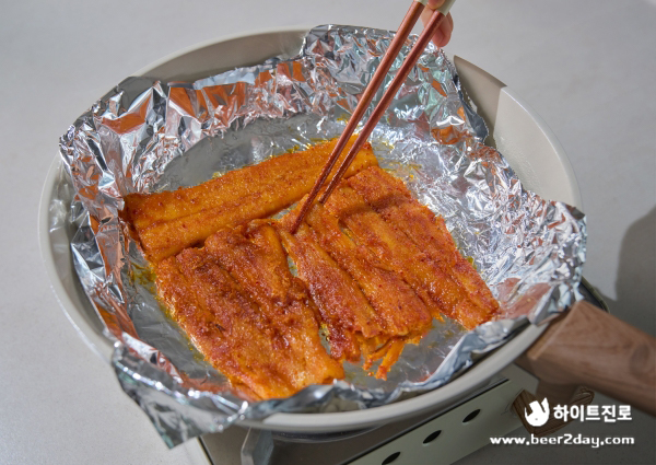 12. 프라이팬에 포일을 한 장 깔아준 뒤, 양념된 더덕을 약불에서 앞뒤로 구워줍니다.