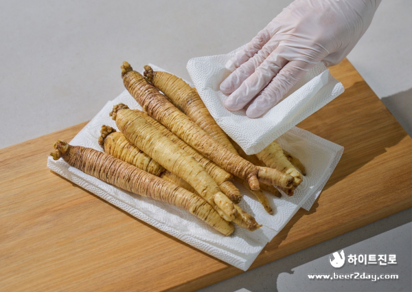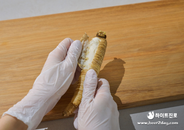 4. 물기가 제거된 더덕은 세로 방향으로 칼집을 내준 후 껍질을 제거해 주세요.