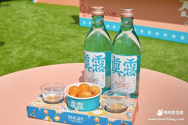 미니 츄러스와 치즈볼로 단짠단짠의 황금비율을 완성한 안주 세트와 금박 가루를 톡톡 얹어 부드러움에 프리미엄까지 더한 진로골드 시음 잔까지! 먹을거리까지 완벽했던 황금비율 놀이공원✨
