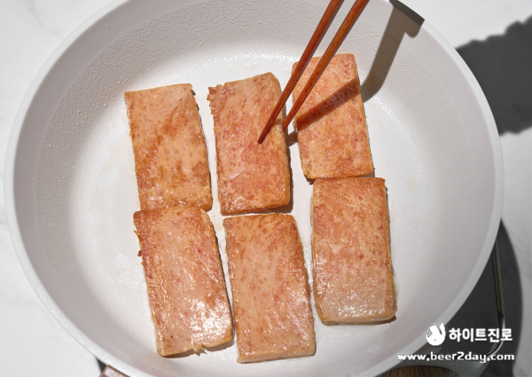 3. 팬에 식용유를 조금 두르고 앞뒤가 노릇할 정도로 햄을 구워주세요.