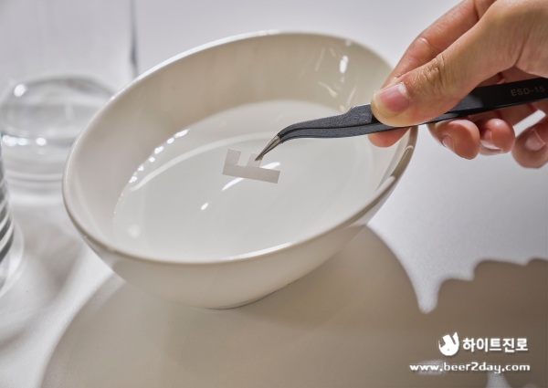 7. 분리된 전사지를 모양이 망가지지 않게 핀셋으로 조심스럽게 잡아 컵에 놓아주세요.
