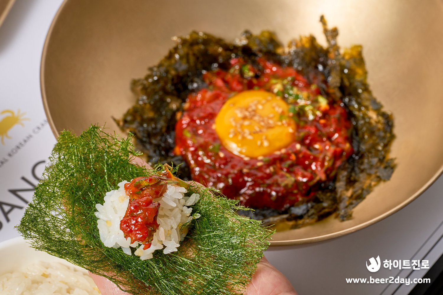 중독적인 맛의 요리와 너무나 잘 어울리는 구운 감태에도 게알을 가득 얹어 한 입에 쏙~