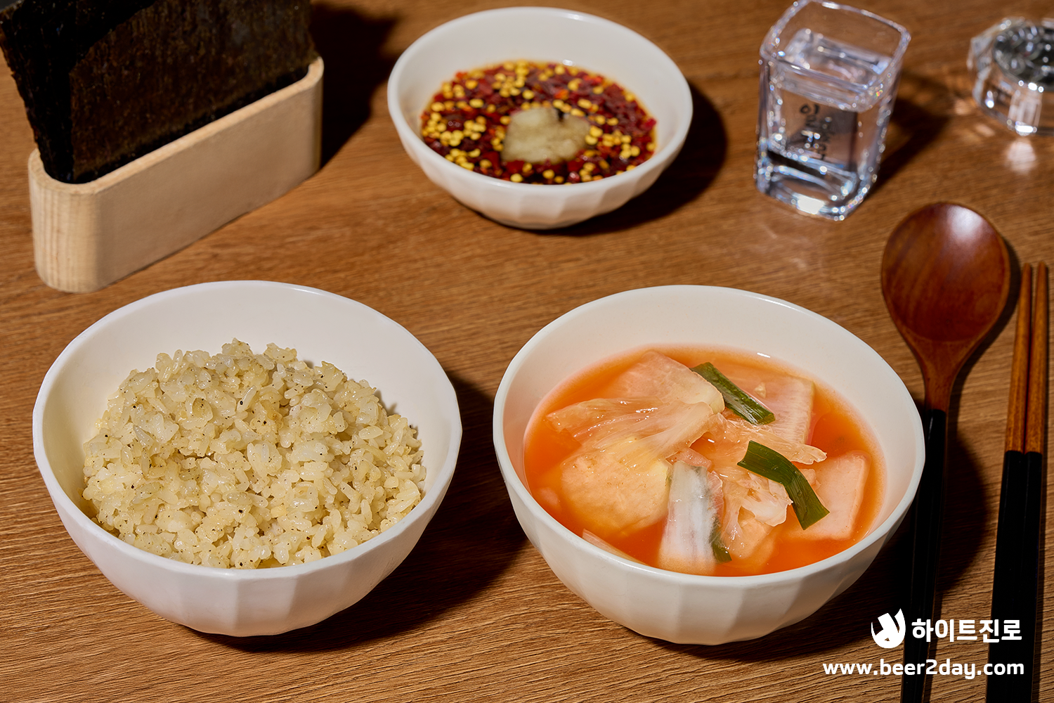 담백, 고소하면서도 살짝 짭짤한 오차즈케 한 숟갈에 목통 숙성 원액을 블렌딩한 일품진로 오크25를 부드럽게 머금으면?