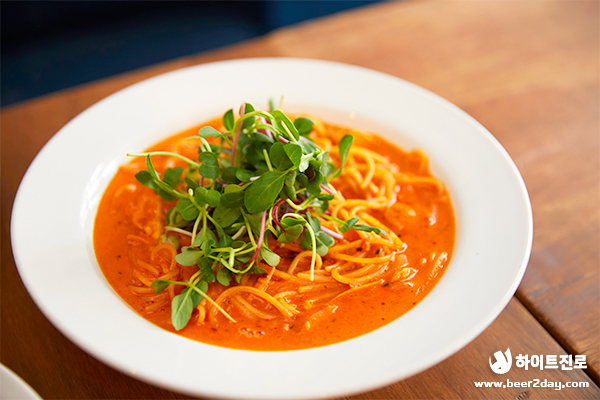 두 번째 메뉴는 로제 베이스를 좋아하는 분들에게 추천해드리고 싶은 ‘매콤 로제 새우 파스타’입니다. 매콤하면서도 꾸덕한 맛 때문에 계속 손이 가는 중독적인 이 맛! 리얼탄산 테라 생맥주와 찰떡궁합인 파스타입니다.