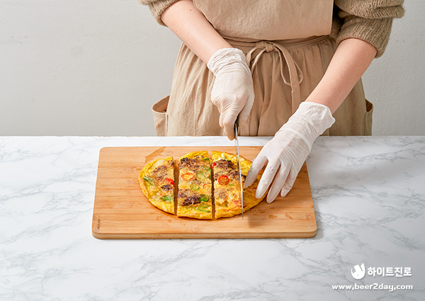 불고기 토핑만으로 비주얼도 맛도 업그레이드! 색다른 매력의 파전이 완성되었습니다. 썰고 남은 양파, 고추를 넣어 만든 간장 소스도 함께 곁들여보세요. 노릇하게 구워진 불고기 파전과 초깔끔한 진로 한 잔이면 우리 집이 바로 전 맛집! 바삭하고 육즙 가득한 파전과 진로의 깔끔함이 더해져, 더욱 찰떡궁합을 자랑합니다. 손님 초대용으로 보기에도 먹기에도 좋은 메뉴를 고민하거나, 간단하면서도 색다른 야식을 찾고 있다면, 불고기 파전으로 정갈한 한 상 차림 어떨까요?