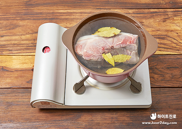 4. 돼지고기 잡내와 불순물을 제거하기 위해 월계수잎 2-3장을 넣고 5분간 팔팔 삶아주세요.