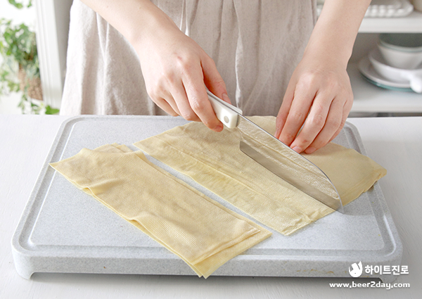 9. 데친 포두부는 약 5cm 너비로 길게 썰어주세요.
