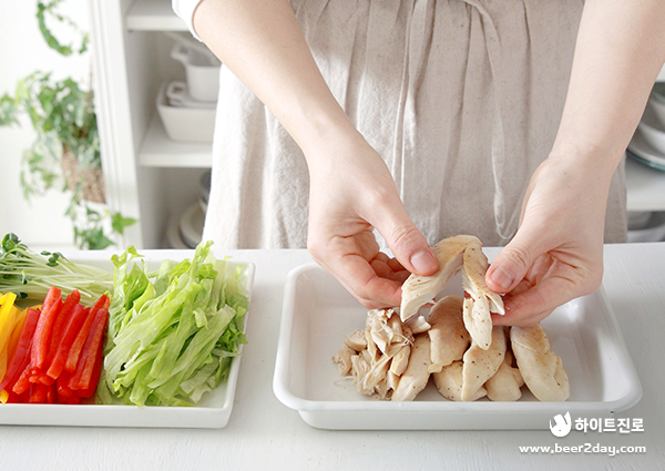 10. 팬에 볶은 닭 안심살은 결 대로 찢어주세요.