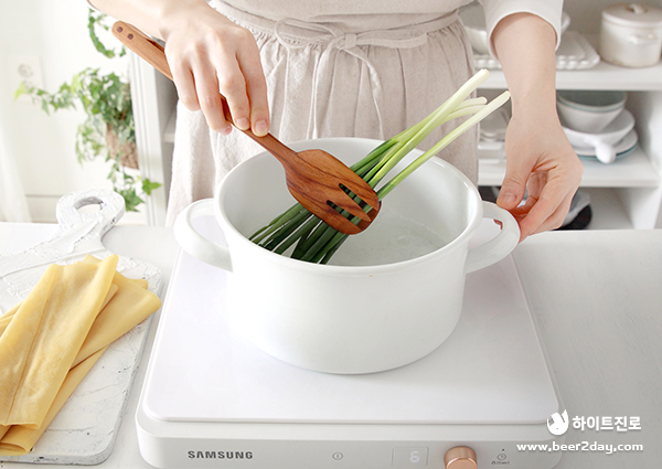 7. 끓는 물에 쪽파를 넣어 살짝 데쳐주세요.