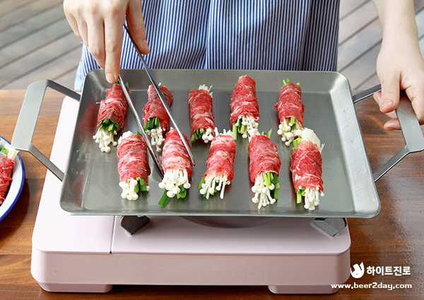 4. 펼친 소고기 위에 팽이 버섯과 부추를 올려 돌돌 말아줍니다.