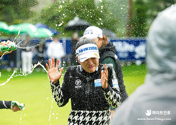 우중혈투 끝에 제22회 하이트진로 챔피언십 메이저 퀸을 차지하게 된 박민지 선수는 마지막 버디 퍼트를 성공함과 동시에 함께한 선수들이 축하하는 맥주 샤워로 우승의 기쁨을 함께 했습니다. 대회 기간동안 계속된 긴장감이 청정한 맥주에 씻겨나가는 듯했습니다.