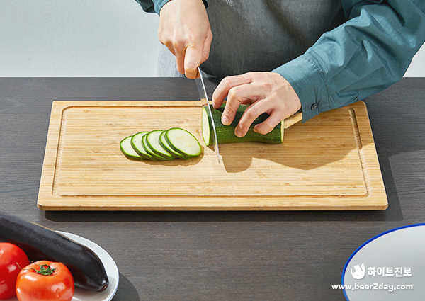 1. 쥬키니 호박을 동그란 모양으로 0.5cm 두께로 썰어줍니다.