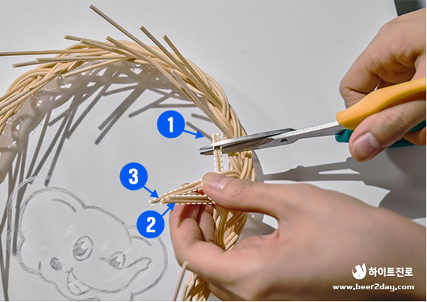 엮인 상태를 유지하고 2번 날대가 3번 날대의 위, 4번 날대의 아래로 오도록 엮은 후 2번의 남은 날대 부분을 잘라줍니다.