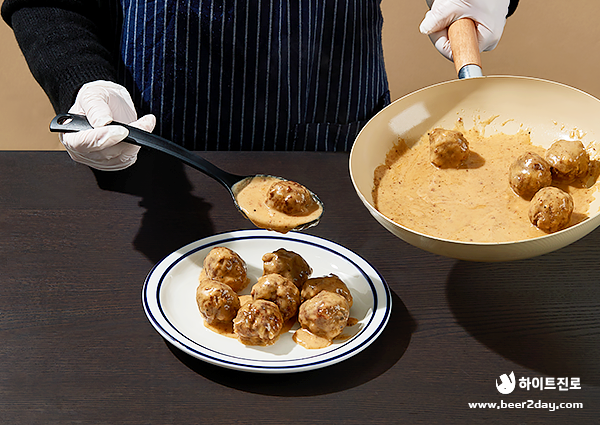 먹음직스러운 셰트불레가 완성되었습니다. 우리가 흔히 아는 토마토 미트볼이 아닌 크림소스 미트볼이라니, 맛도 비주얼도 더욱 색다른 느낌인데요! 부드러운 크림을 가득 머금은 미트볼을 한 입 베어 무니 스웨덴 전통의 맛이 입안 가득 퍼지는 듯 합니다😋 고소한 풍미가 가득한 셰트불레와 깨끗한 참이슬의 궁합! 정말 기대되지 않나요?