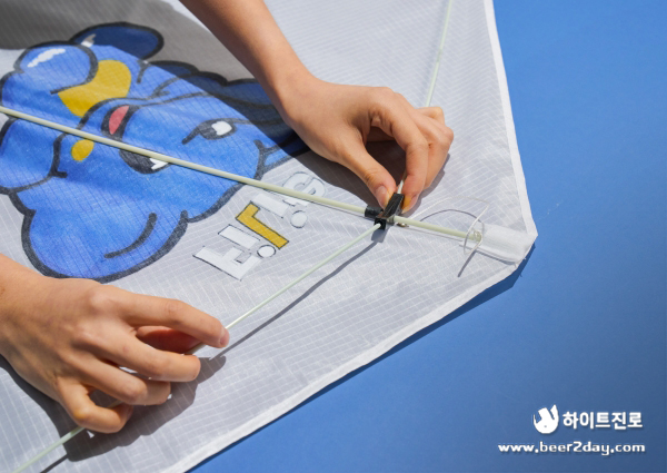 10. 연에 있는 구멍에 가장 긴 살대에 있는 실을 넣고 연의 앞면으로 빼서 얼레 실과 연결해 주세요.