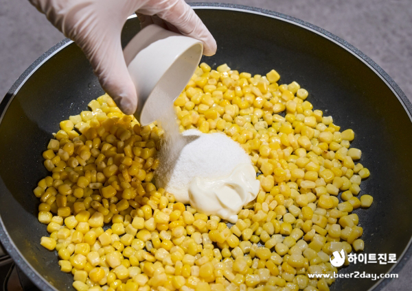 2. 프라이팬에 버터를 녹인 후 옥수수를 넣고 중불로 바닥에 수분이 보이지 않을 때까지 볶아줍니다.
