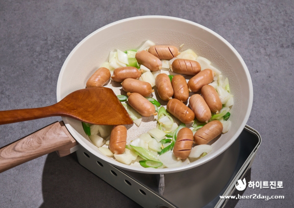 4. 프라이팬에 식용유를 살짝 두른 뒤 대파, 양파 먼저 볶다가 소시지를 넣어줍니다.