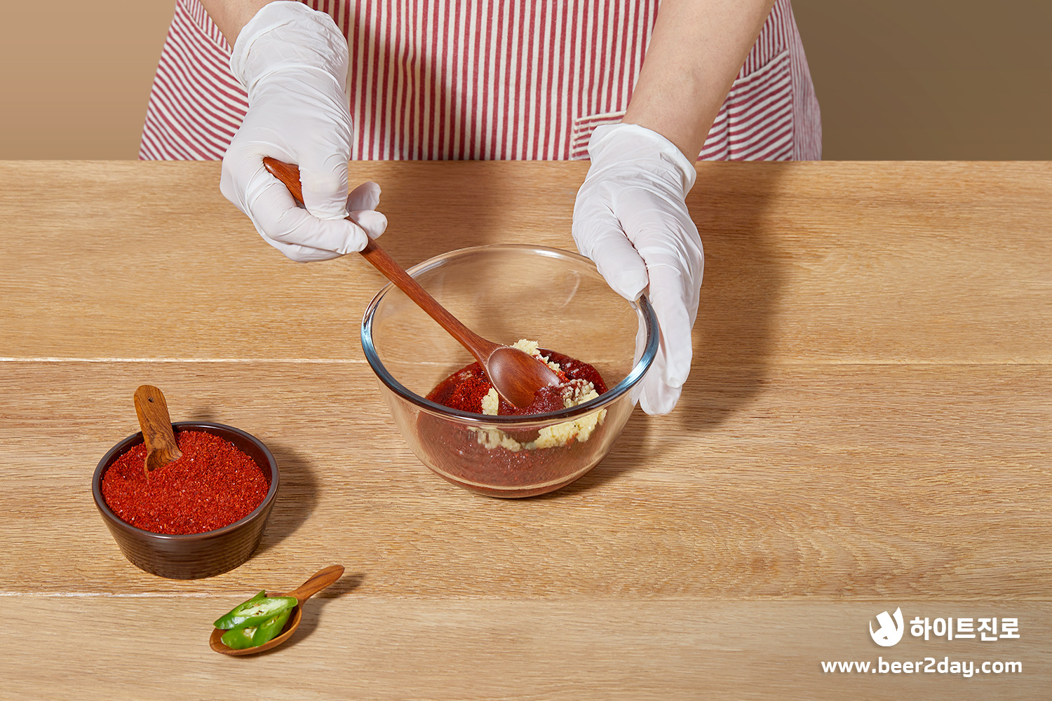 5.볼에 멸치 액젓 1T, 고춧가루 3T, 고추장 1T, 맛술 2T, 다진마늘 2T, 매실청 1T를 넣고 양념장을 만들어주세요.