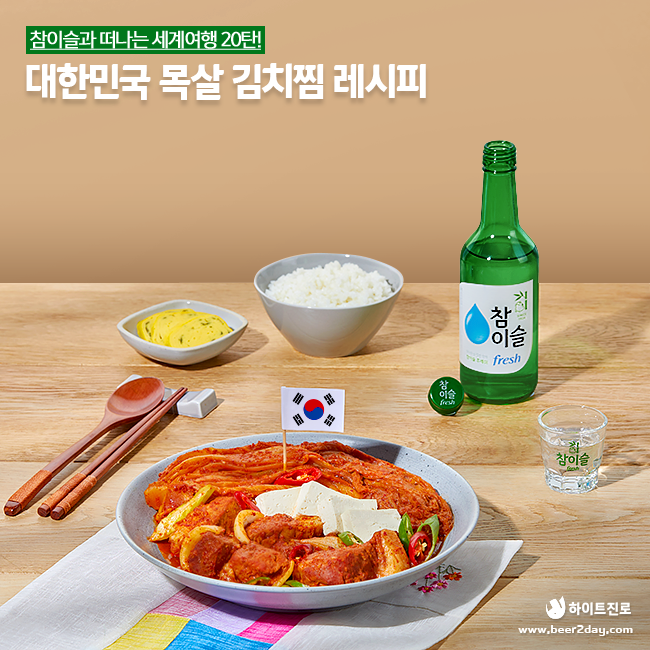 살랑이는 봄바람에 나른해지는 계절, 따스한 봄볕 때문일까요? 조금은 느슨해진 입맛에 긴장감을 주는 매~콤한 음식이 당기는데요. 매운맛은 뭐니 뭐니 해도 K-매운맛!🌶️ 오늘은 한국인의 소울푸드 '김치'를 통으로 넣어 담백한 돼지 목살과 함께 푸-욱 끓여 낸 진정한 밥.도.둑 목살 김치찜 레시피를 소개할까 합니다. 세계로 뻗어나가는 K-컬처의 인기에 힘입어 다양한 한식 문화와 레시피도 전 세계인의 주목을 받고 있는데요. 글로벌 소주 No.1 참이슬의 본고장! 스무번째를 끝으로 참이슬과 떠나는 마지막 세계여행 종착지, 소주의 나라 '대한민국'으로 지금 바로 떠나봅니다. 😀